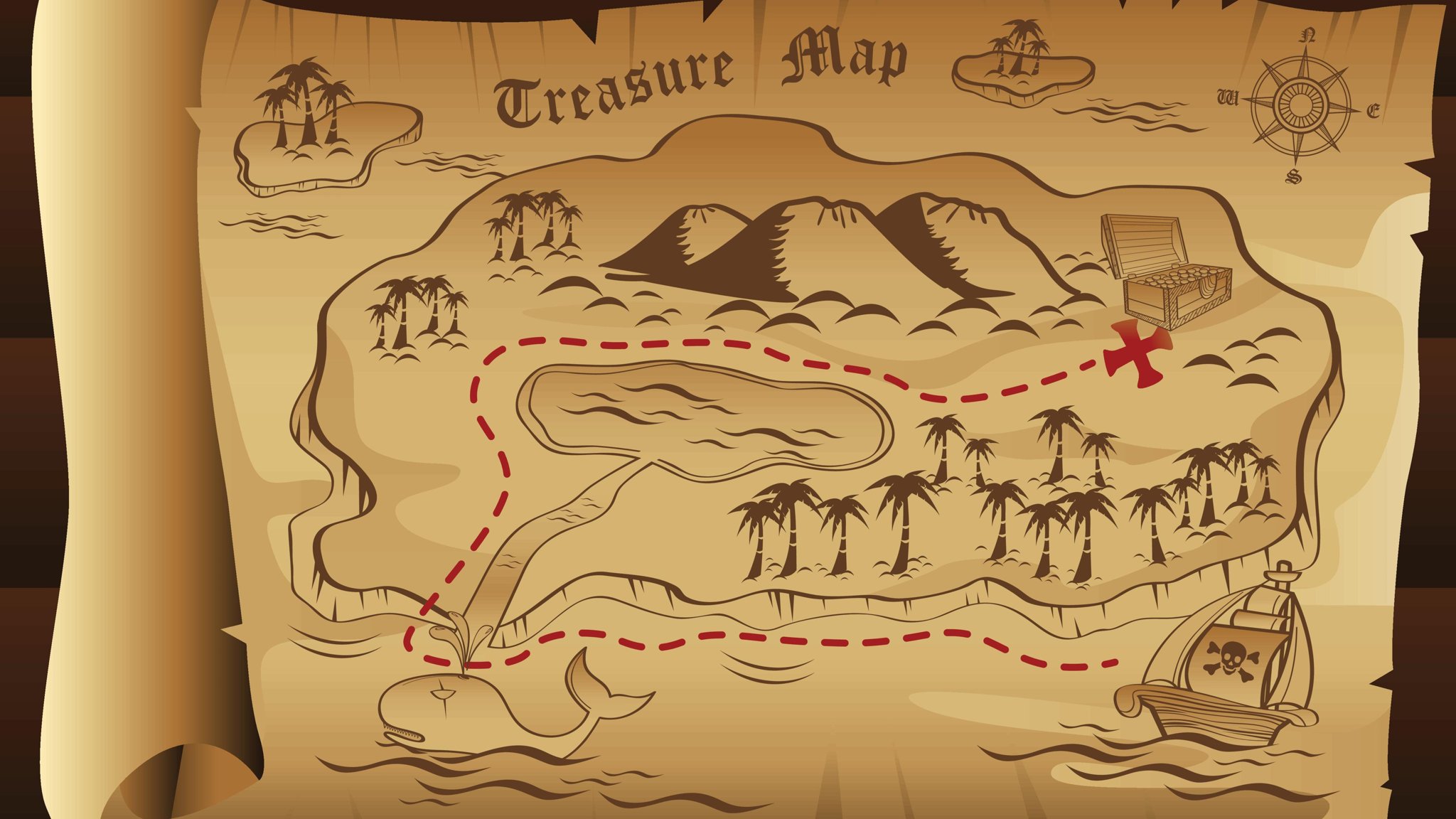 A treasure map is a map that marks the location of buried treasure, a lost mine, a valuable secret or a hidden locale.more common in fiction than in reality, pirate treasure maps are often depicted in works of fiction as hand drawn and containing arcane clues for the characters to follow.
